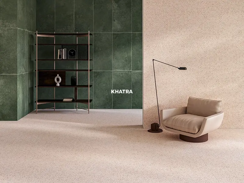 Thiết kế phòng khách (ánh sáng vàng) sử dụng gạch Terrazzo màu Blush Beige lát nền phối với gạch 06GM màu Moss Green ốp mảng nhấn