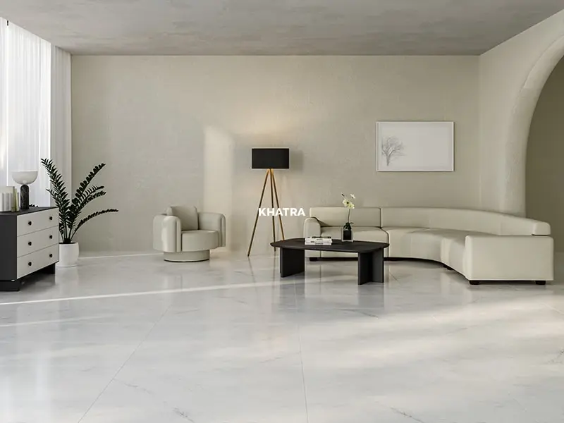 Thiết kế phòng khách hiện đại sử dụng mẫu gạch KR-612176GY kích thước 600×1200 màu trắng ngà, vân stone lát nền