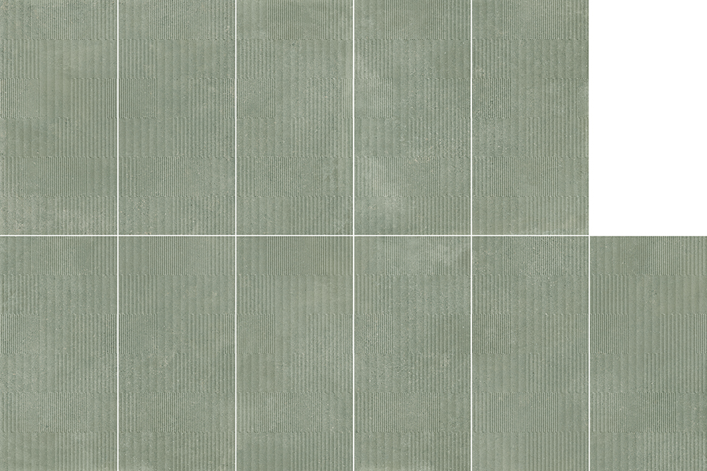 Cận cảnh gạch Pottery 06GM màu green ốp mảng tường nhấn dưới ánh sáng trực tiếp của nắng buổi trưa.