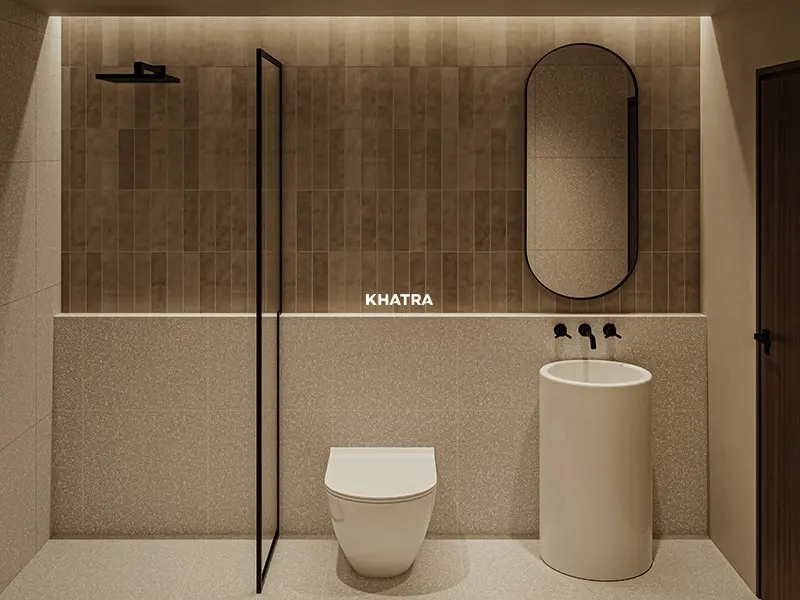 Thiết kế nhà tắm sử dụng gạch thẻ S14 (75×300) ốp tường phối với gạch Terrazzo KR-W88236 (600×600) lát nền