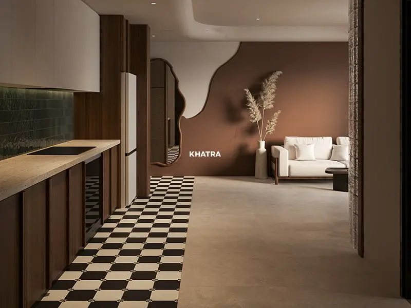 Thiết kế căn hộ chung cư phong cách Japandi sử dụng gạch bông trắng đen MF3032 – MF3192 phối gạch Alba Beige lát nền không gian Khách-Bếp